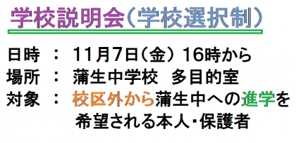 本校の通学区域外(蒲生中学校以外の校区)から、蒲生中学校への入学を希望される新1年生の本人・保護者対象に、学校説明会を開催いたします。