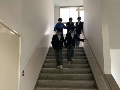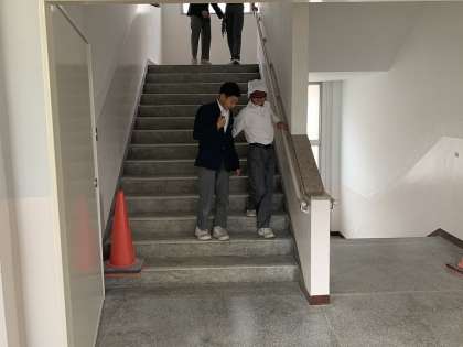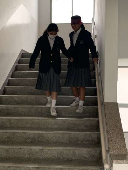 11月22日(金)の5、6限に、2年生は城東区社会福祉協議会と松本様の協力で、障がい者理解学習を行いました。写真は、アイスマスクをする人と介助者に分かれて、校内を歩く体験をしている様子です。