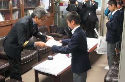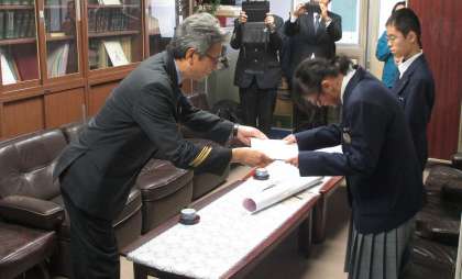 12月3日(火)放課後に、JR京橋駅駅長様をはじめ、JR京橋駅の関係者の方が来校されて、本校校長室で、最優秀賞と優秀賞の表彰式並びに記念品贈呈式が行われました。