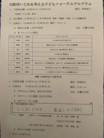 大阪市の多くの中学校から生徒会役員が集まり、各ブロックからの取り組みの報告や発表と、大阪市いじめを許さないスローガンの策定を行いました。2019年の全市スローガンは「いじめSTOP 見逃し0(ゼロ)」に決まりました。
