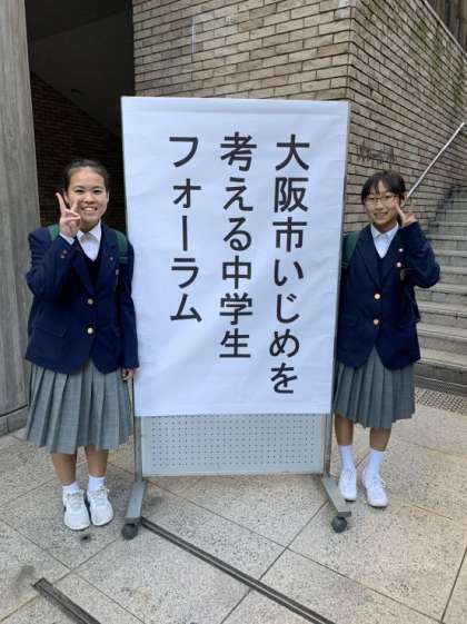 12月8日(日)14:00〜16:00に、で阿倍野区民センターで「大阪市いじめを考える中学生フォーラム」が開催されました。本校からは生徒会会長の佐々木さん、副会長の田村さんが参加しました。