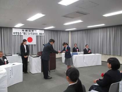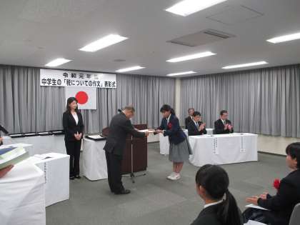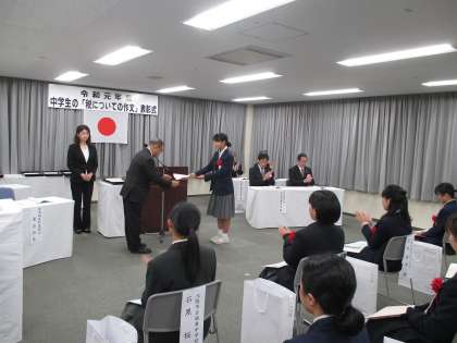 いずれも夏休み期間に資料を集め、自分で文章を組み立てて1200字の作文とし、まとめたものを税務署に提出しました。緊張感の中、授賞式に臨みました。