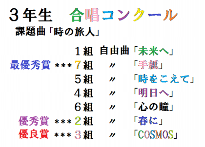 各クラスとも早朝からの練習、放課後練習と自主的な取り組みを積み重ねてきました。その成果が素晴らしい歌声になり、体育館に響きました。「最優秀賞」受賞クラスは3年7組、「優秀賞」3年2組、「優良賞」3年3組でした。