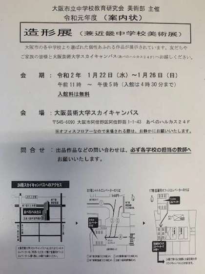 1月22日(水)〜26日(日)まで、あべのハルカスの24階(大阪芸術大学スカイキャンパス)において「大阪市立中学校造形展(兼近畿中学校美術展)」が開催されています。