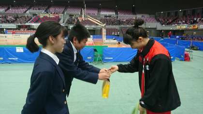 試合後には、先月、蒲生中学校に講演に来ていただいた網本麻里選手に、1年生の生徒たちの応援メッセージを手渡すことができました。