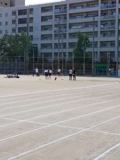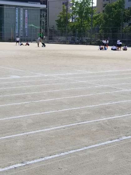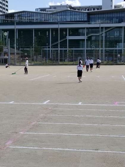 写真は、蒲生グランドにおいて、体育委員と教員で会場ラインを引いている様子です。