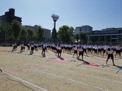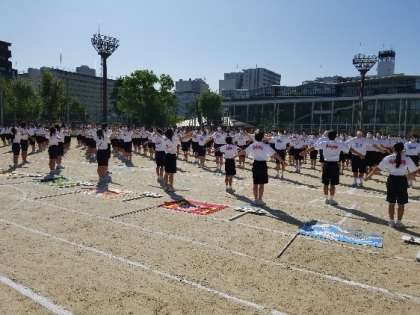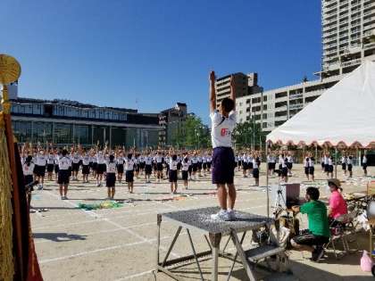 写真は、ラジオ体操の様子です。みなさん、真剣にやっています。
