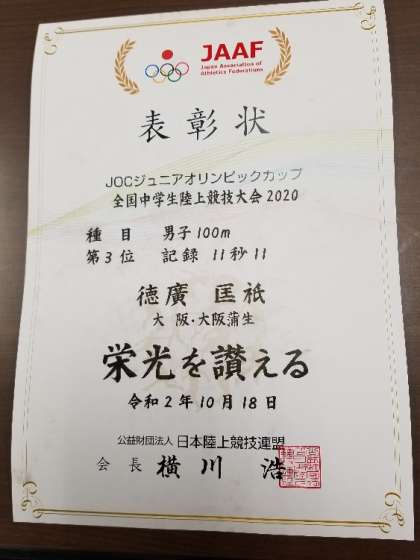 JOC大会第3日目の10月18日(日)、100mのA決勝が行われ、徳廣くんが11秒11の記録をマークし、見事に全国第3位に入賞しました!