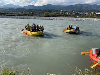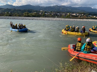 歓声を上げて、次々とラフティングボートが出て行きます。