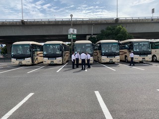 長島スパーランドに到着しました。バスの中でチケットとクーポンを配っています。快晴です。