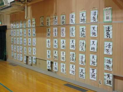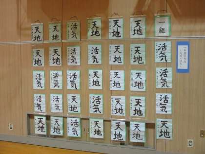 写真は、体育館内に展示されている1年生国語科の書写作品「天地」「活気」です。1年1〜3組の作品です。