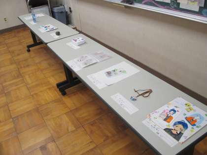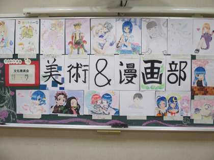 写真は、多目的室内に展示されている美術&マンガ部の作品です。