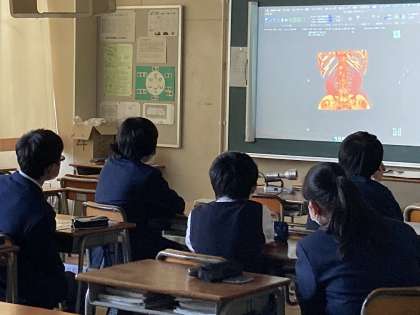 左写真:診療放射線技師の授業です。X線やMRIの装置を動かすソフトについて説明を受けています。