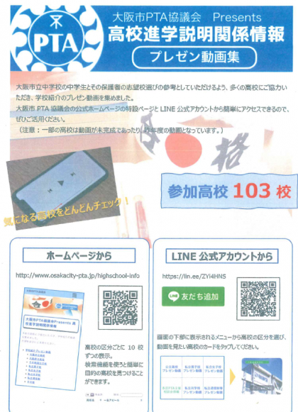 この度、PTA協議会から高校進学説明関係情報プレゼン動画集をいただきました。中学生とその保護者の志望校選びの参考にしていただけたらということですので掲載させていただきます。