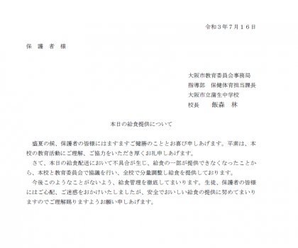 本日の給食運搬の不具合について、お子様、保護者の皆様には大変ご心配をおかけし、誠に申し訳ありませんでした。