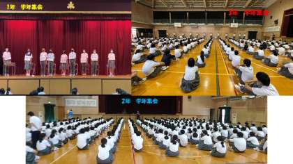 本日の1限目に1年生、3限目に2年生、4限目に3年生が学年集会を行いました。各学年の先生方から夏休みを迎えるにあたっての勉強面・生活面・健康面のお話があり、1学期の反省と2学期に向けての心構えのお話をしていました。1年生では、クラス委員長が1年の振り返りを寸劇にし、生徒たちに分かりやすく伝えていました。