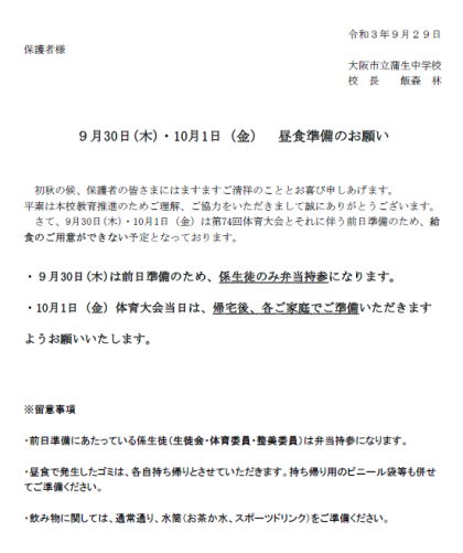 9月30日(木)・10月1日(金) 昼食準備のお願い
