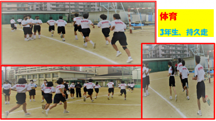 3年生の持久走の授業では、だれも手を抜くことなく、一生懸命走りました。仲間たちの応援が力になり、走り切りました。