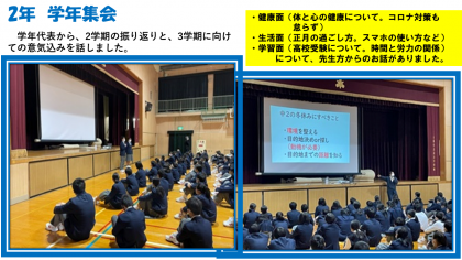 今日は2学期最後の学年集会が行われました。各学年の学年代表や学級委員長たちが前に立ち、今学期の振り返りと3学期の目標について話をしました。先生方のまとめのお話もしっかり聞いていました。