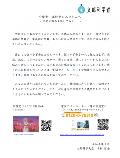 まだまだ寒い日が続きます。健康に十分留意し、充実した学校生活を送ってください。文部科学省からメッセージが来ていますので掲載します。
