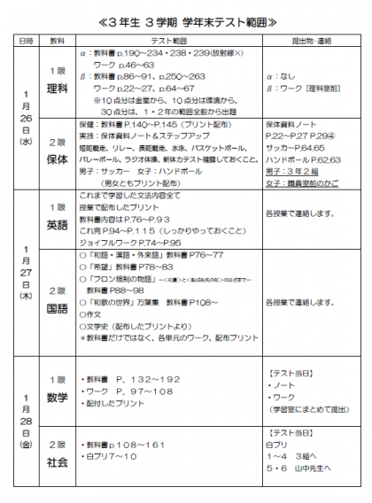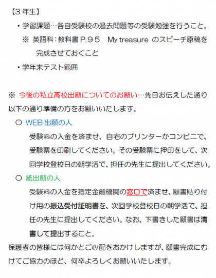3年生の課題、願書、テスト範囲等について連絡させていただきます。