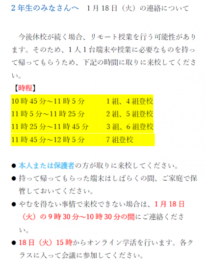1,2年生は学年休業ですが、今後のリモート授業に備えて、タブレット端末をお渡しします。その時程、課題などお知らせいたします。