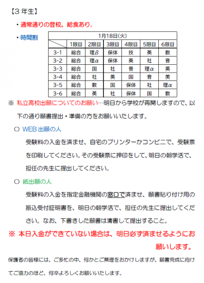 3年生は明日、通常授業を行い、給食を実施します。明日の連絡をいたしますのでよろしくお願いたします。
