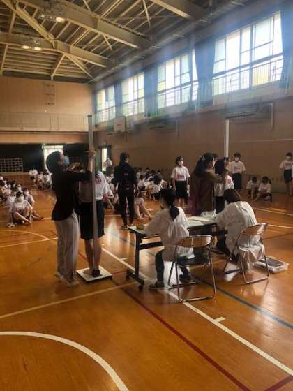 みなさん、おはようございます。本日は午前より二測定や視力検査などを行いました。中学校の3年間で20センチ以上背が伸びる生徒もいます。1年でどのくらい大きくなりましたか?