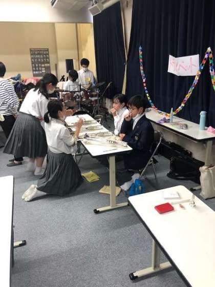 部活動体験2日目の様子です。科学部はサイエンスショーを吹奏楽部は先輩が楽器の鳴らし方を教えています。