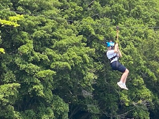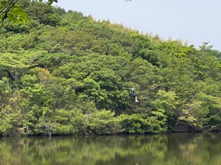 猛烈なスピードのジップラインは池の上を飛んでいるようです。