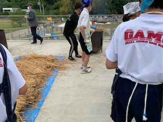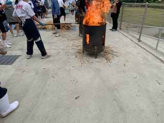 次にさばいた鰹を藁で焼きます。火力の大きさに驚いています。まんべんなく焼くのが難しいです。
