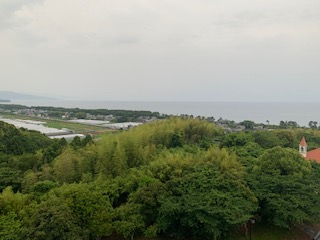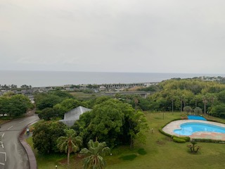 ホテルのテラスから望む太平洋です。曇ですが、雨は降っていません。香川県の予報も曇です。過ごしやすい1日になりそうです。