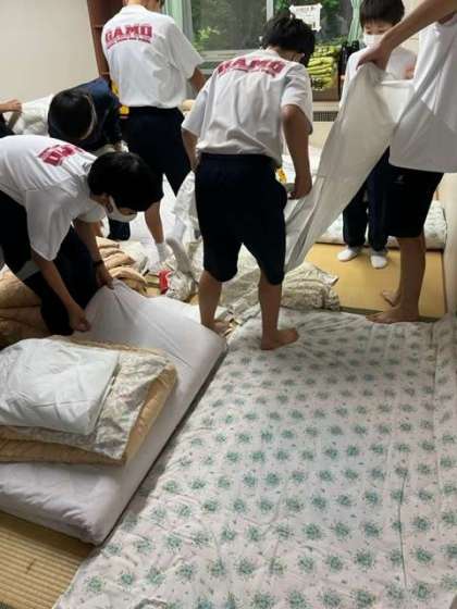 みんなで声を掛け合い、起こしたり準備をしたり。朝の少ない時間で協力して寝具の片付けをしています。