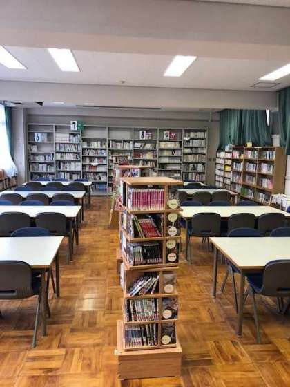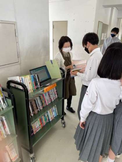 本校の図書館には、約14,000冊の本が置かれています。毎週火曜日には学校司書の方が休み時間を利用し、ブックトラックに本を積んで移動図書館をしてくれています。