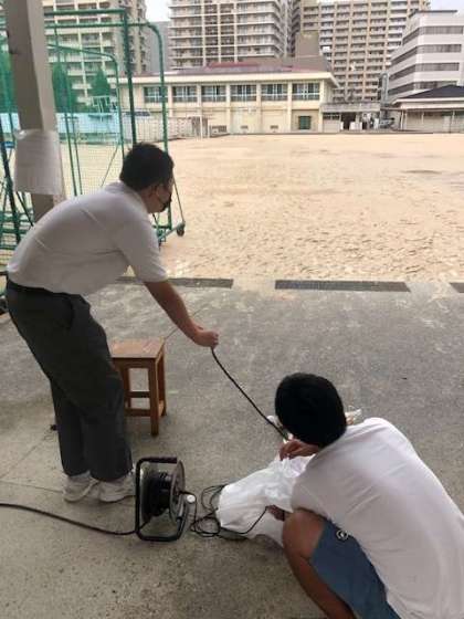 3年生技術授業の夏休み宿題で、ペットボトルロケット製作があります。曇りの天気ではありましたが、数名の生徒が試し打ちに来ていました。