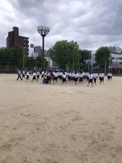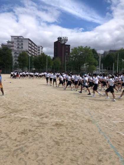 蒲生グラウンドは台風の影響も少なく、今日の練習は涼しい中で行なっています。三年生は集団演技の練習をしています。斜め交差をする足踏みはとても難しそうですが、生徒や先生も頑張っています!