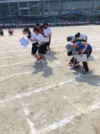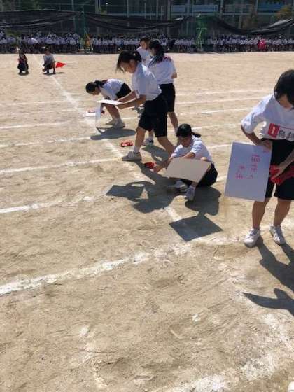 プログラム5番バラエティーAです。画用紙に書かれたお題に答え、その相手と二人三脚でゴールを目指す新競技です!