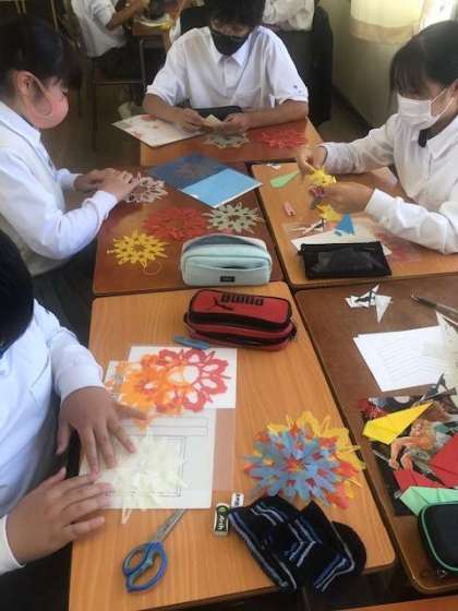 4時間目の総合の時間は文化発表会の取り組みです。一年生はステンドアート作りを二、三年生は合唱練習や作品作りに取り組んでいます。