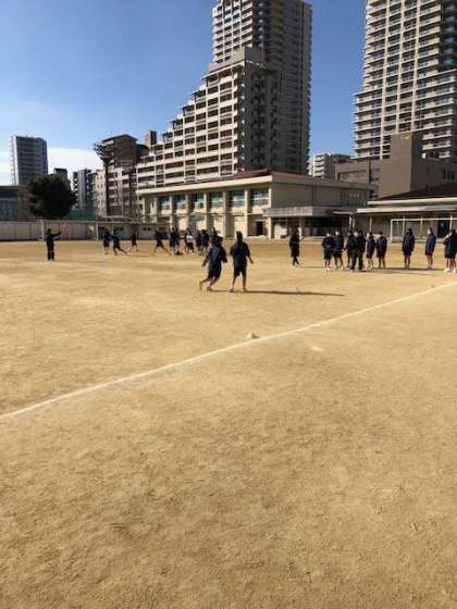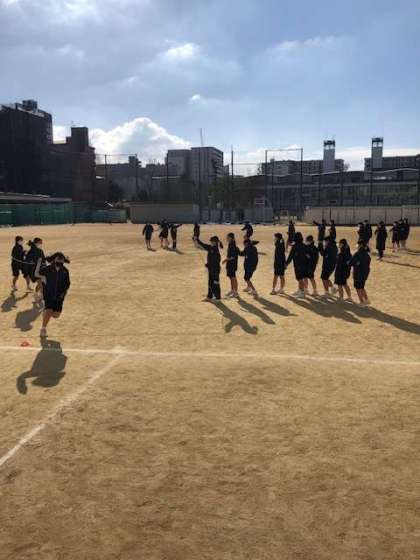 持久走で1000メートル走り終わった後、みんなで大縄跳びをしています。天気が良くて気持ち良さそうです。受験勉強のストレスも身体を動かす事で発散出来そうですね!