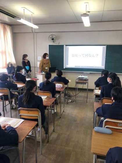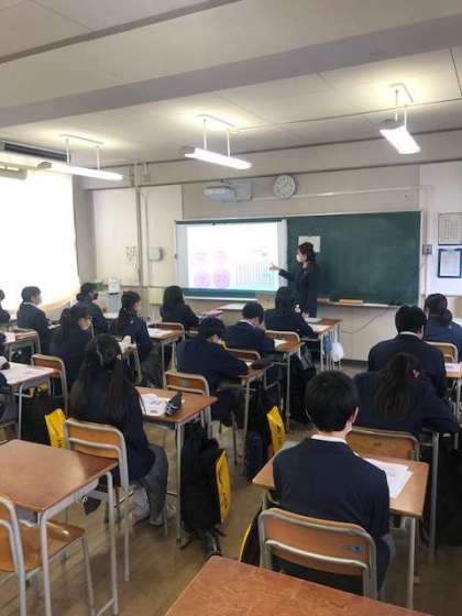本日、5.6限目に一年生は「業界研究in蒲生中学校」と題し、職業講話のために9社の事業所さんに来校していただきました。鉄道業、レジャー施設、介護施設、化粧品製造などさまざまな職種の方が来ていただきました。