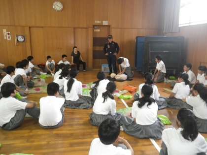 心肺蘇生法の訓練として、AEDの使用と人形を使っての胸骨圧迫訓練を行いました。