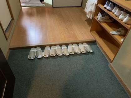 就寝準備をしています。スリッパもお行儀良くそろっています。明日の朝は忙しくなりそうです。おやすみなさい。
