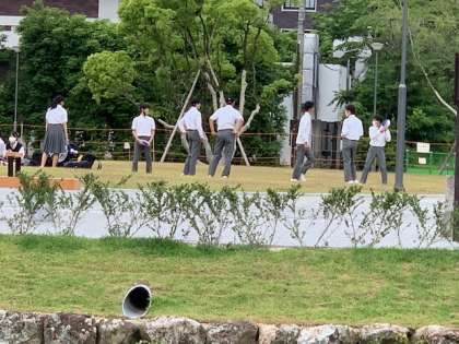 ガチャで取ったカツオを投げて遊ぶ少年たち。