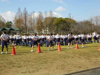 今日のマラソン大会に向け、体育の授業でお互いに励まし合いながら