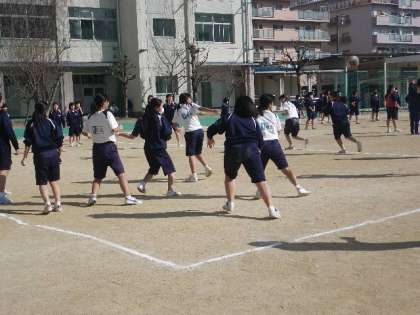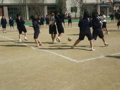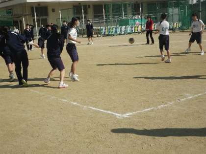 ボールが地面と平行に勢いよく、左から右の選手へ向かっています。