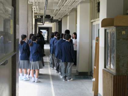 お昼からは、校舎見学を行い、特別教室がどこにあるのか、また職員室へ入室するには、どのような掛け声をして入るのかなどを確認していました。