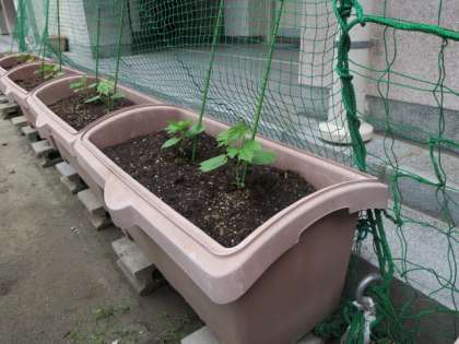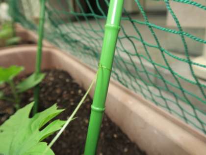 ひとつのゴーヤをよく見ると、細い弦が1本支柱に巻きついていました。