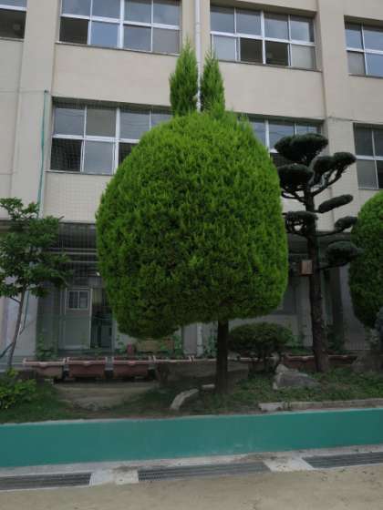 本校では、毎年この時期に校庭に植えている樹木の選定作業を行っています。一緒にトトロの散髪も行いました。