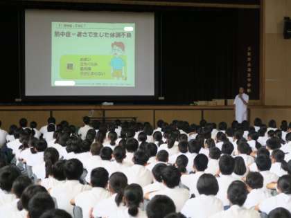 本日、期末テストが終わった後、体育館で部活動を行っている生徒へ 熱中症講話を行いました。部活動の生徒のみで400名を超える生徒が参加しました。