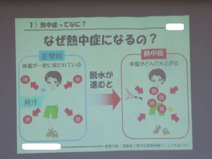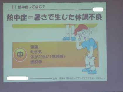 講師の方から、熱中症になれば、どのような症状が体に出るのか、なぜ熱中症になるのかなどプレゼンテーションを使いながら分かりやすく説明していただきました。
